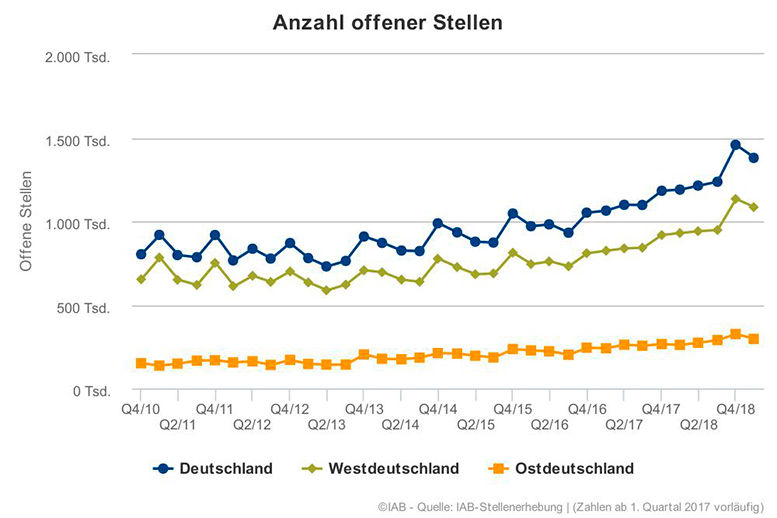 Im 1. Quartal 2019 gab es bundesweit rund 1,38 Millionen offene Stellen. Gegenüber dem 4. Quartal 2018 verringerte sich die Zahl der offenen Stellen um 78.000, gegenüber dem ersten Quartal 2018 stieg sie um 190.000.